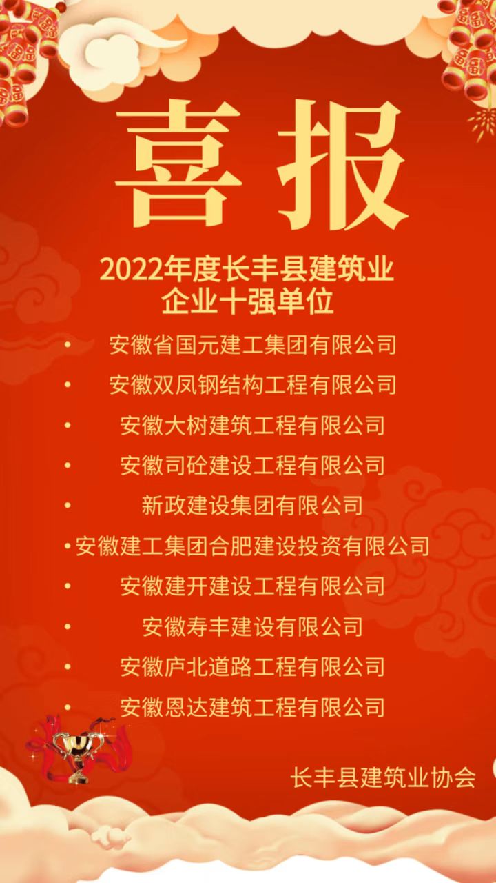 喜报┃热烈祝贺安徽双凤钢结构工程有限公司荣获“2022年度长丰县建筑业十强企业”称号