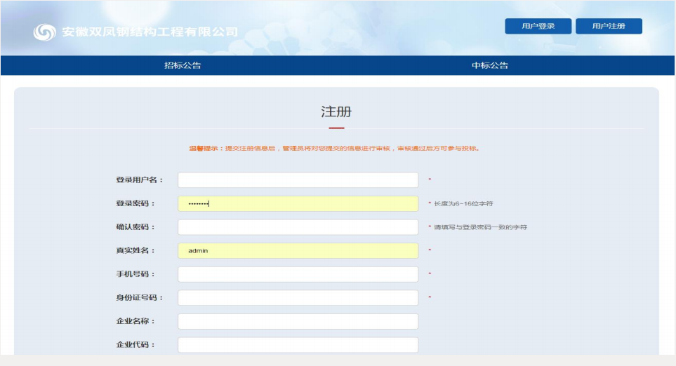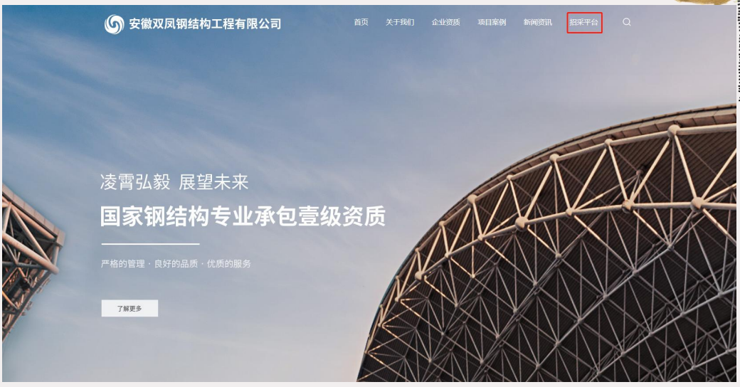 https://www.ahsfgg.cn/ (安徽双凤钢结构工程有限公司官网),进入首页后点击页面上右上方"招采平台"按钮进入。(详见下图)