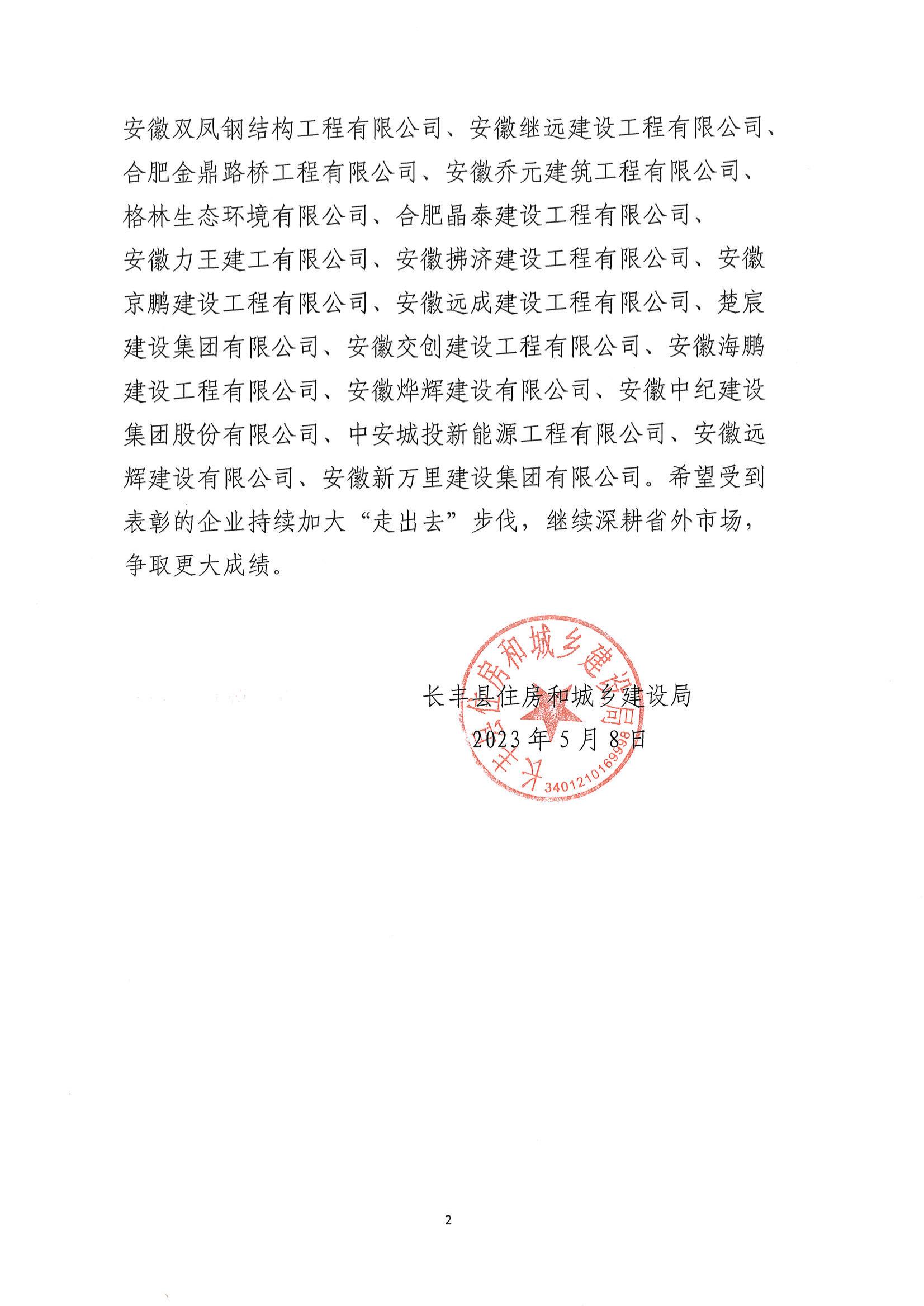 关于表彰2023年一季度长丰县建筑业“外向型企业”优秀企业的通报