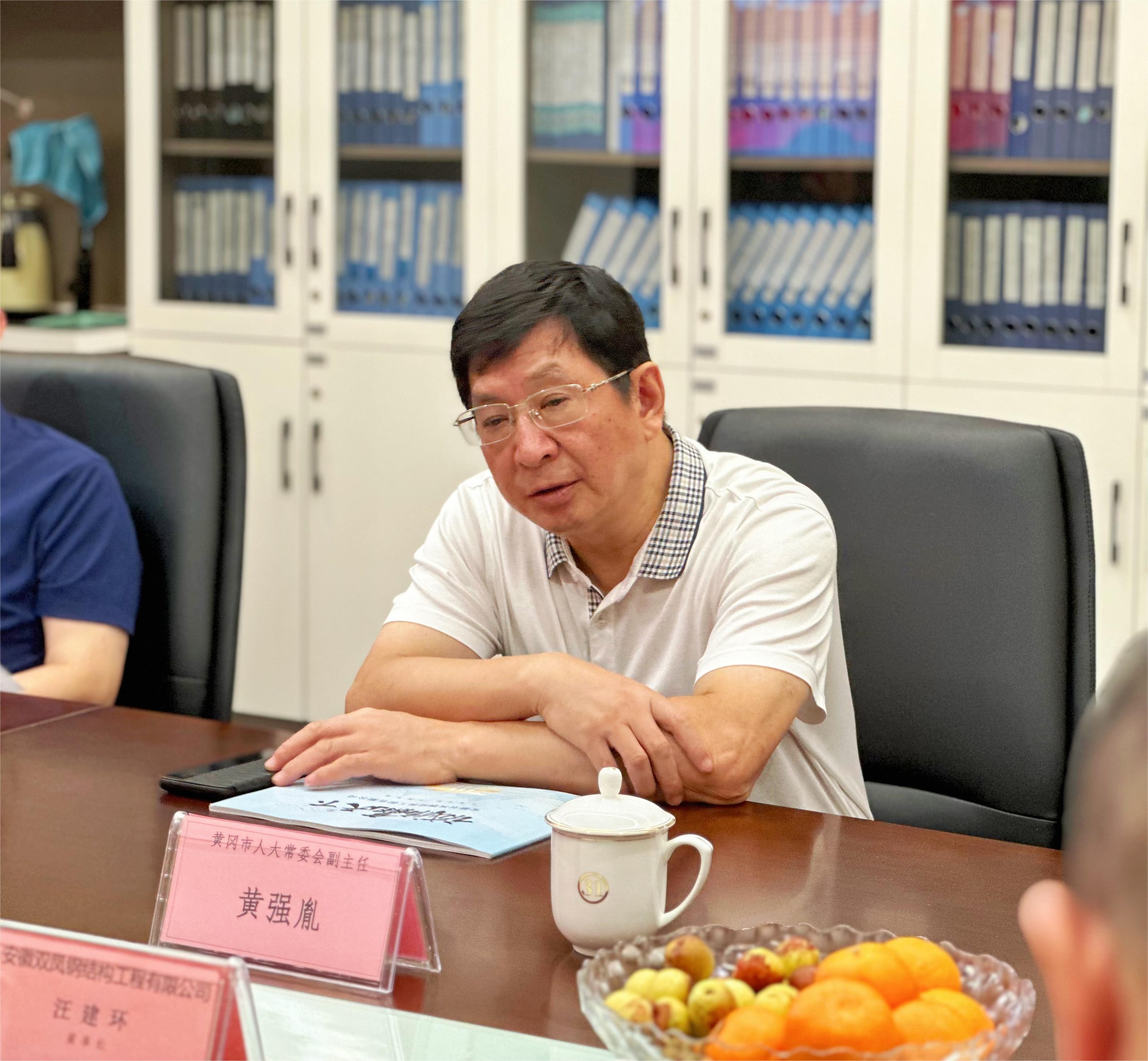 7月27日,湖北省黄冈市人大副主任黄强胤、住建局局长李学军、人大常委会干部杨光莅临安徽双凤钢结构工程有限公司考察走访,黄冈商会秘书长操三腾陪同调研。公司董事长汪建环、总经理吴正江、副总汪胡彪、周磊等领导热情接待并参加座谈。