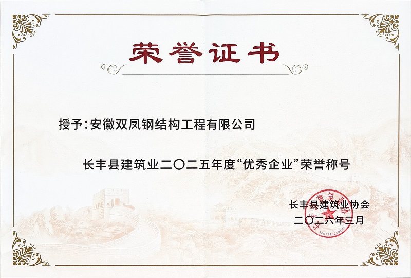 2026年4月2日,长丰县建筑业协会第一届第五次会员大会在北城上上座酒店隆重召开,大会对 2025 年度长丰县建筑业发展表现突出的企业进行表彰。我司凭借稳健的经营实力、过硬的工程质量与良好的行业信誉,成功获评长丰县 2025 年度建筑业优秀企业,这份荣誉既是对公司过去一年工作的高度肯定,更是激励我们持续奋进的强大动力。