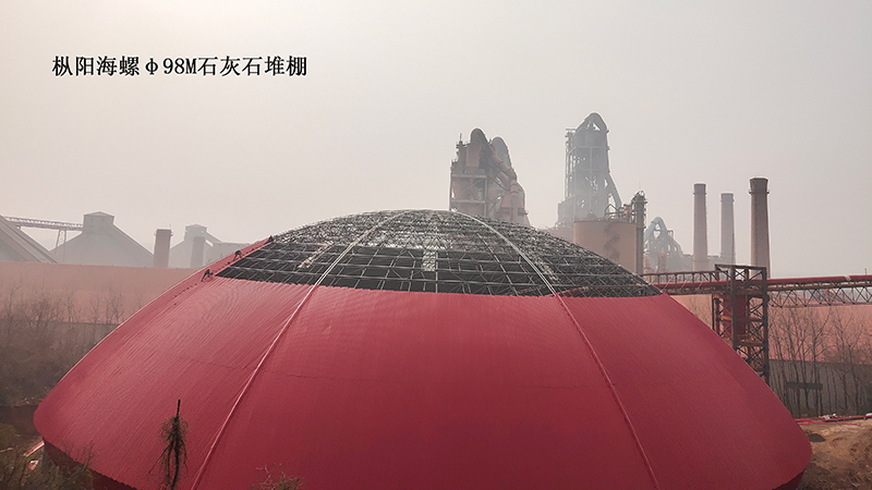 承建枞阳海螺石灰石堆棚上部网架及屋面系统的制作安装,跨度98M