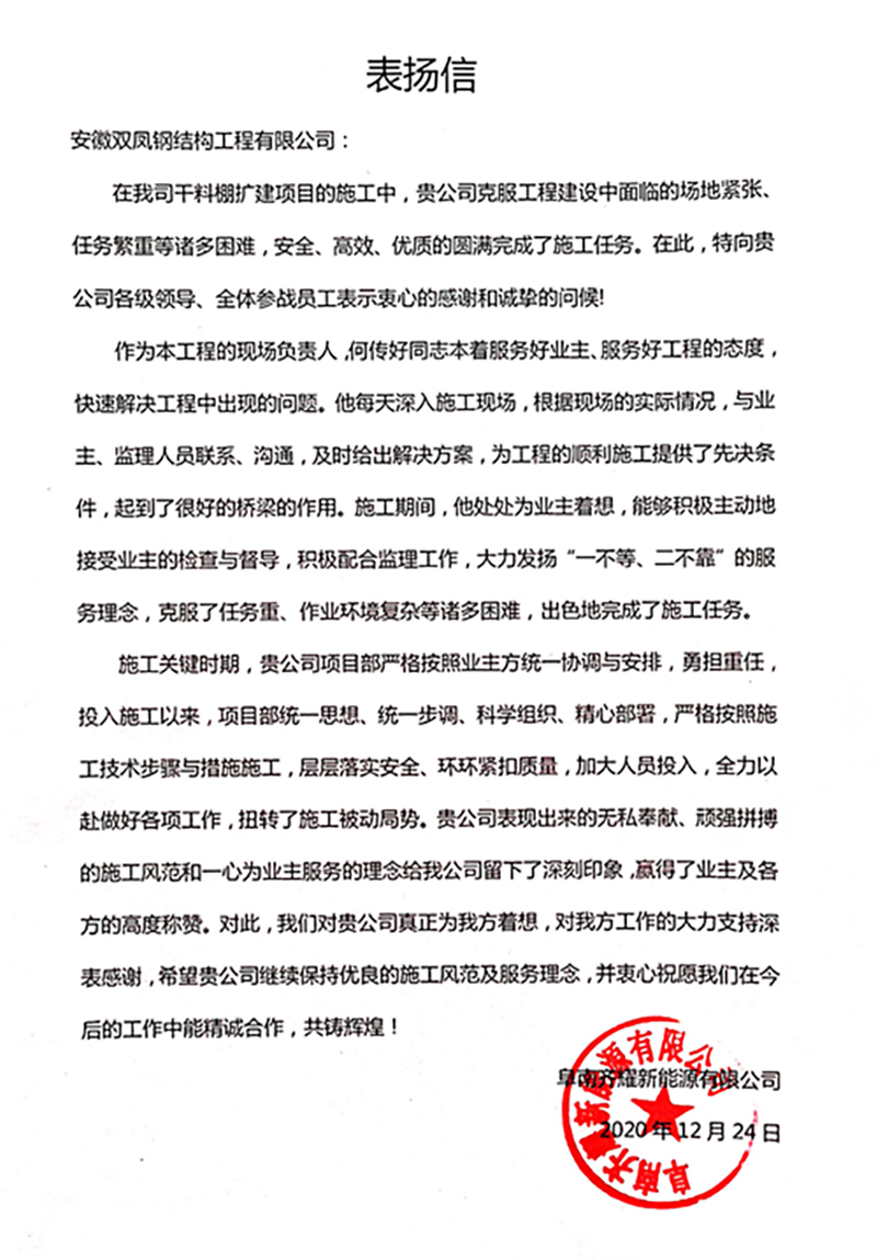 阜南齐耀电厂表扬信