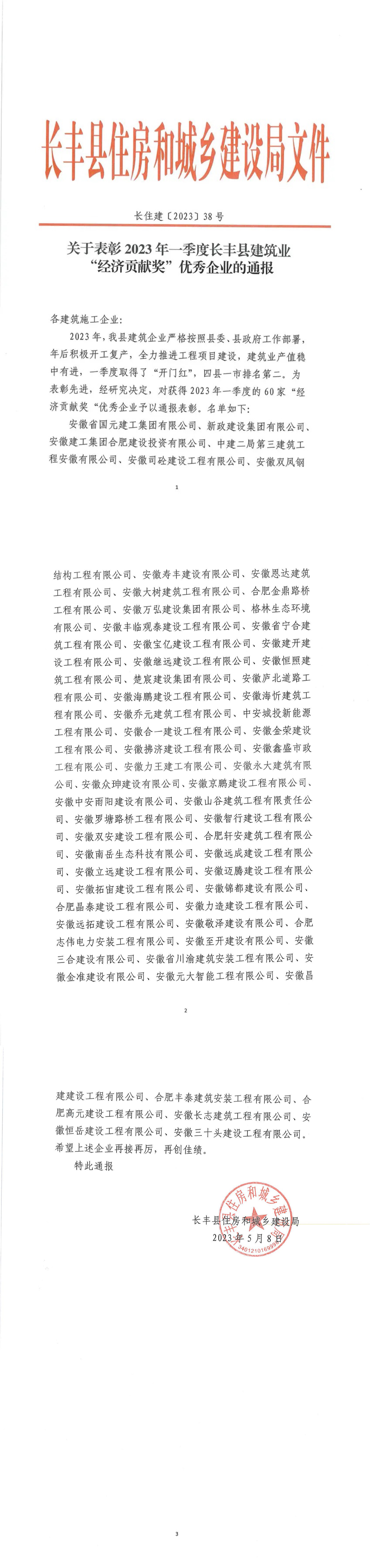 关于表彰2023年一季度长丰县建筑业“经济贡献奖”优秀企业的通报