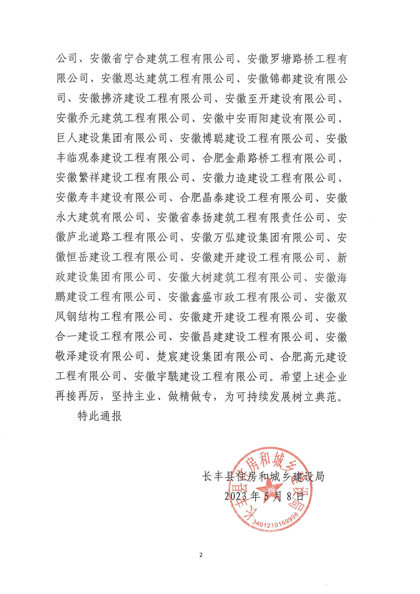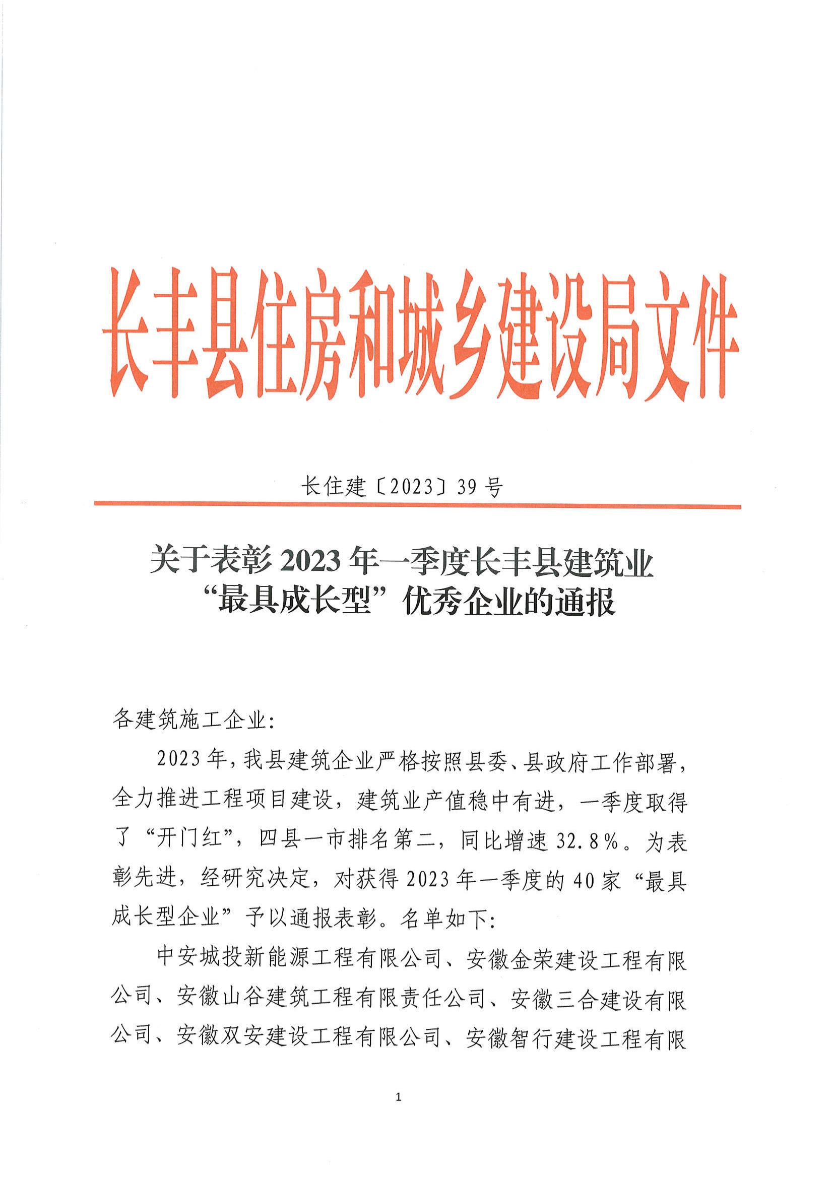 关于表彰2023年一季度长丰县建筑业“最具成长型”优秀企业的通报