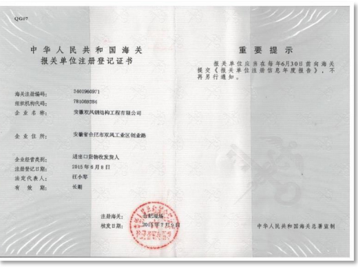海关报关单位注册登记证书