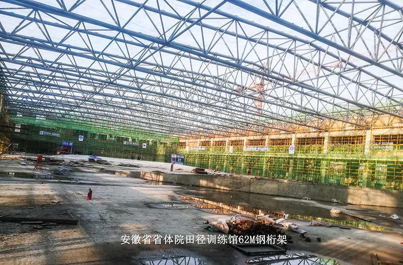 本工程为安徽体育运动职业技术学校室内田径训练馆钢结构工程,屋盖采用钢管桁架结构,下弦层多点支承在混凝土框架上。主桁架共16榀,其中倒三角主桁架12榀,平面主桁架4榀,建筑面积约8300㎡,跨度62M;